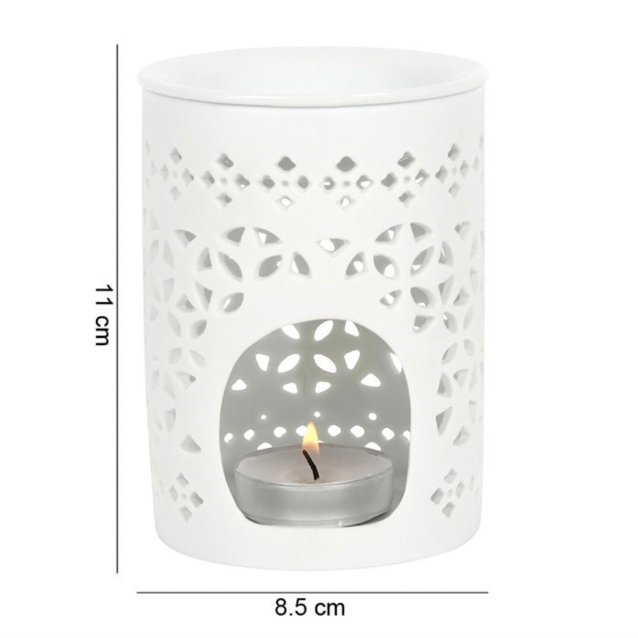 This white matte cut out oil burner will look great in any home. Once a lit tealight is placed inside it casts pretty shadows thanks to the cut out details.